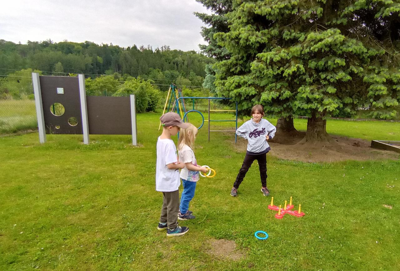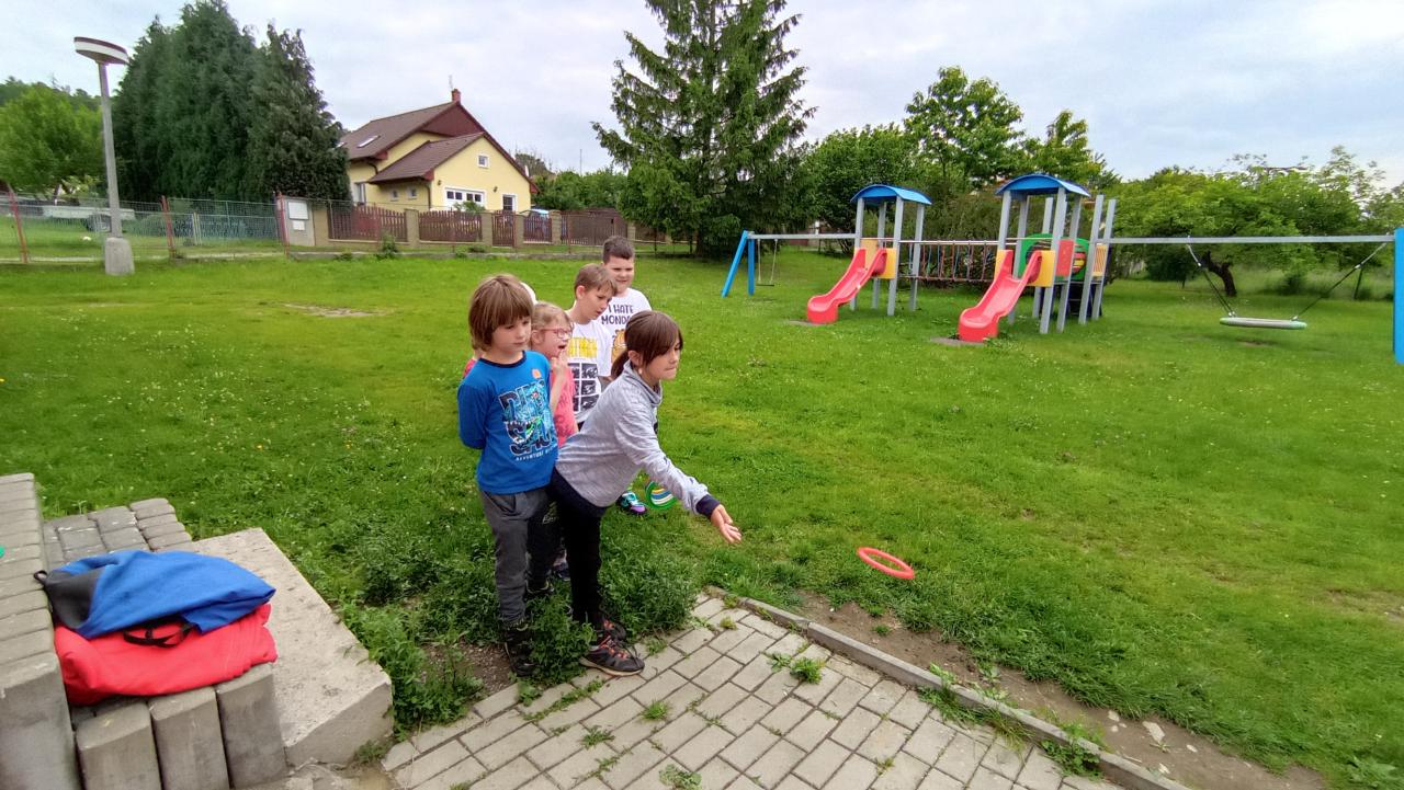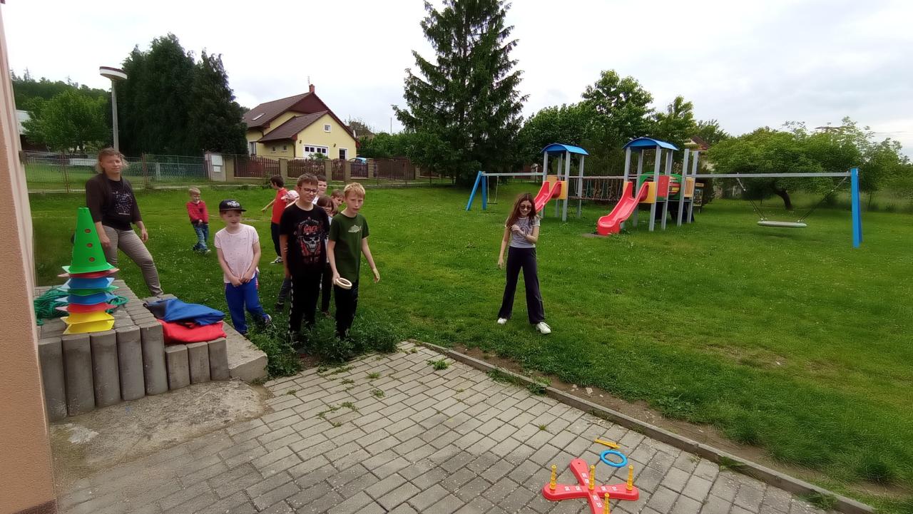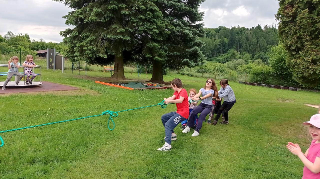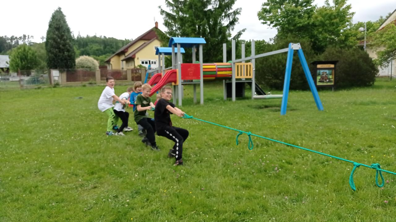 V první části soutěžily mateřinkové děti a školáci je vedli po jednotlivých stanovištích. Pak proběhla soutěž v přetahování lanem dívky proti chlapcům. Po osvěžení zmrzlinou si disciplíny vyzkoušeli i školáci.