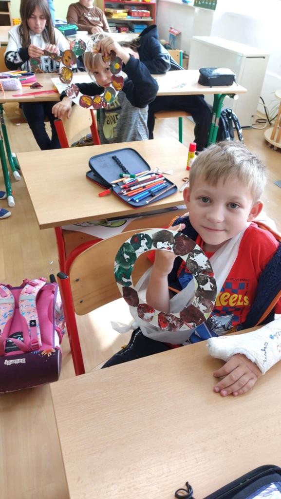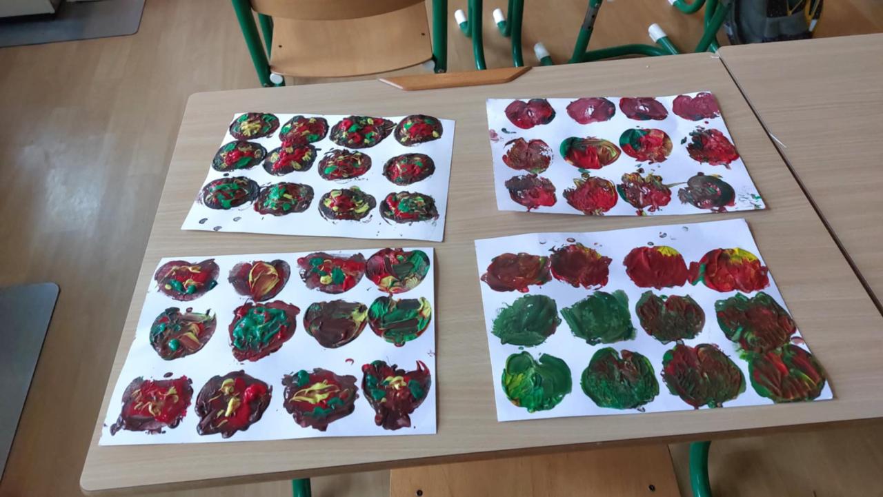 Žáci v hodině pracovních činností tvořili s listy a jablky (jako razítky)